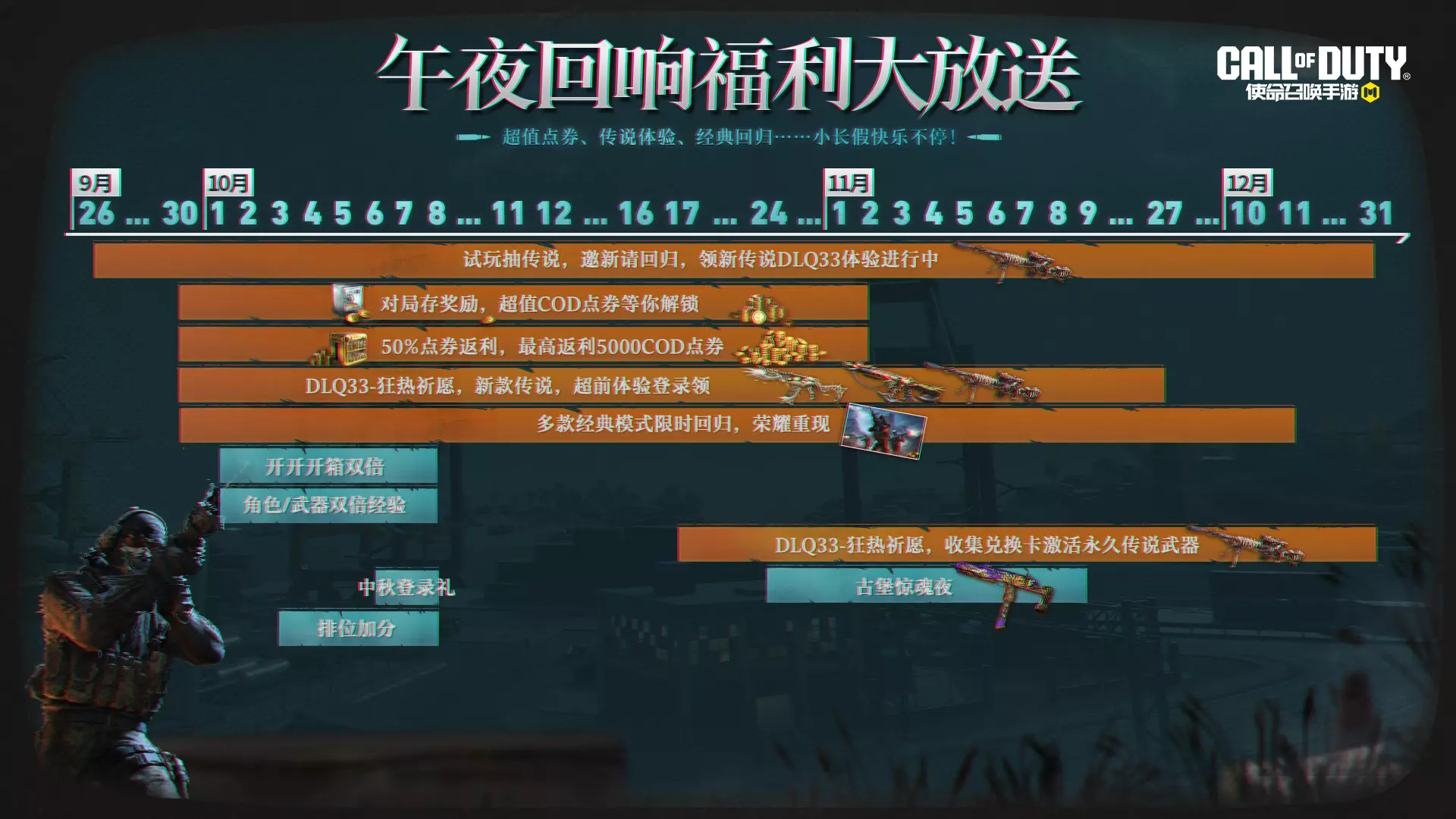 9月30日-11月2日期间,战士们在游戏商城内累计消费COD点券,即可在活动页面领取50%的COD点券返利,最高可获得5000COD点券!