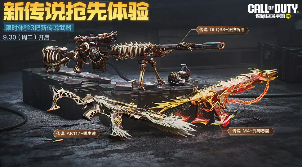 新传说抢先体验再度来袭!9月30日起,将会陆续开启DLQ33-狂热祈愿、AK117-蜕生瞳、M4-咒缚恶魔的试玩机会,是不是你的本命武器,战士们试试就知道啦!