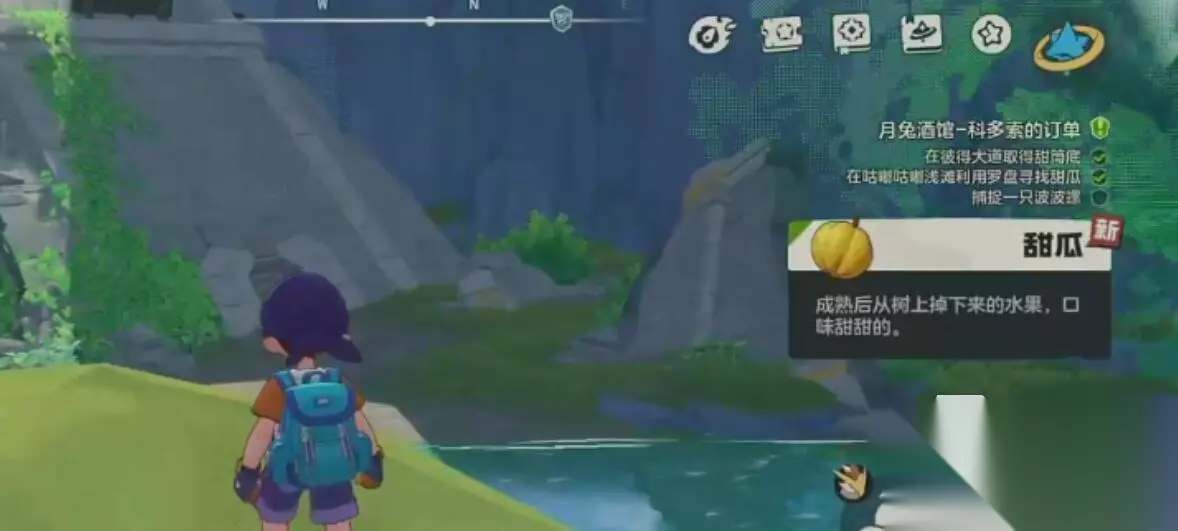 与店内NPC对话后,任务将触发剧情分支——店员会提示甜筒原料不足,需协助找回三只遗失的甜筒。这三只甜筒均位于甜品店外围小径范围内,无需离开街道,只需围绕店铺外围仔细搜索即可全部拾取,完成后即视为第一阶段任务达成。 第二步目标为获取甜瓜,地点位于咕咕海滩。建议优先传送至首领营地附近,随后打开背包,选中并使用罗盘道具。罗盘指针将自动校准方向,持续跟随箭头指引前行,路径明确、无须盲目探索,短时间即可抵达甜瓜所在位置,拾取后即完成该环节。
