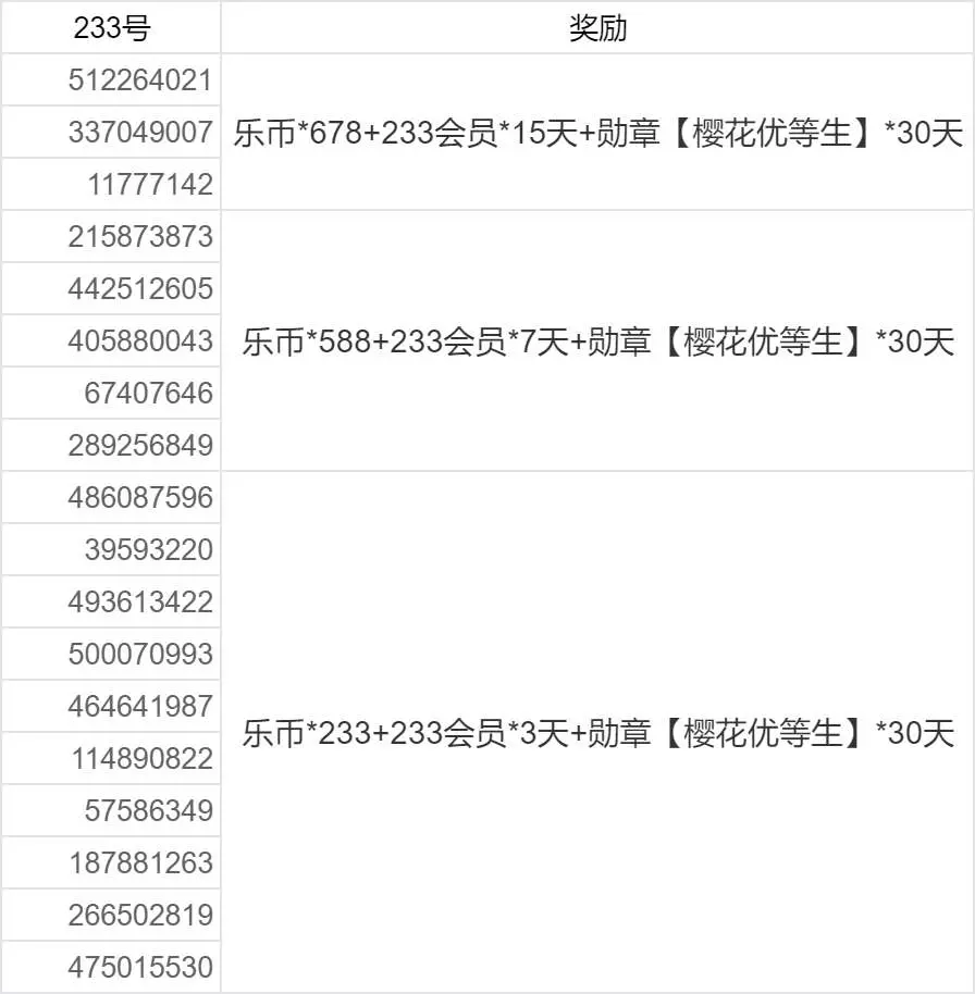 随机抽取10名玩家送出:乐币*233+233会员*3天+勋章【樱花优等生】*30天
