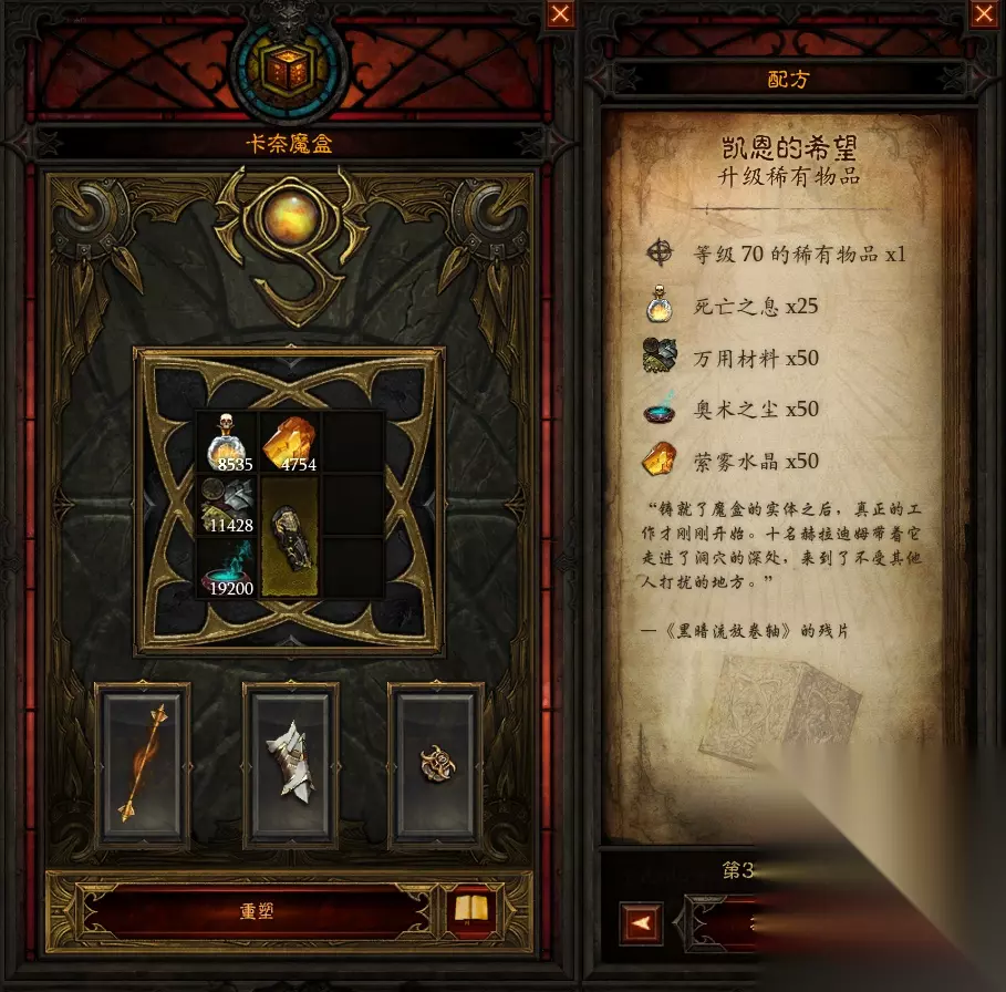 以上全部完成后,就可以按shift+L打开天梯查看这个职业的天梯排行榜,复制别人的技能和装备,一定要看看几个人的技能和装备,合理搭配根据你目前拥有的设备。 如果在刷装备的过程中找不到自己想要的装备,还可以通过赌博、制作来获得装备。赌博需要消耗血石碎片,消耗25血石碎片的装备优先。 制作装备,使用卡奈魔方制作传奇装备,需要一定的材料和黄色套装。