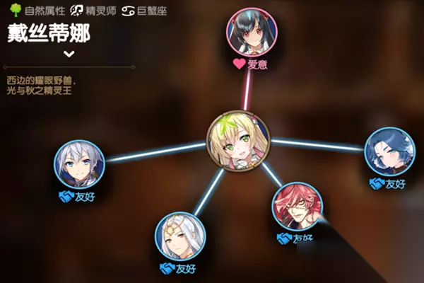 关系图一览 1、光之瑞儿(爱意)――精灵王戴丝蒂娜最疼惜的精灵师。因此在瑞儿死后,便仿照她的样子制作了分身; 2、拉斯(友好)――信任并依赖瑞儿的同伴。如果是瑞儿相信的人,应该就值得信任的吧; 3、审判者绮世(友好)――据信任并依赖瑞儿的同伴。如果是瑞儿相信的人,应该就值得信任的吧; 4、汀果(友好)――得到精灵王玛尔里库斯祝福的人,那个人果然值得被选中; 5、多米妮尔(友好)――得到了精灵王尼克斯特祝福的人,孩子,你是足以继承尼克斯特之名的存在;