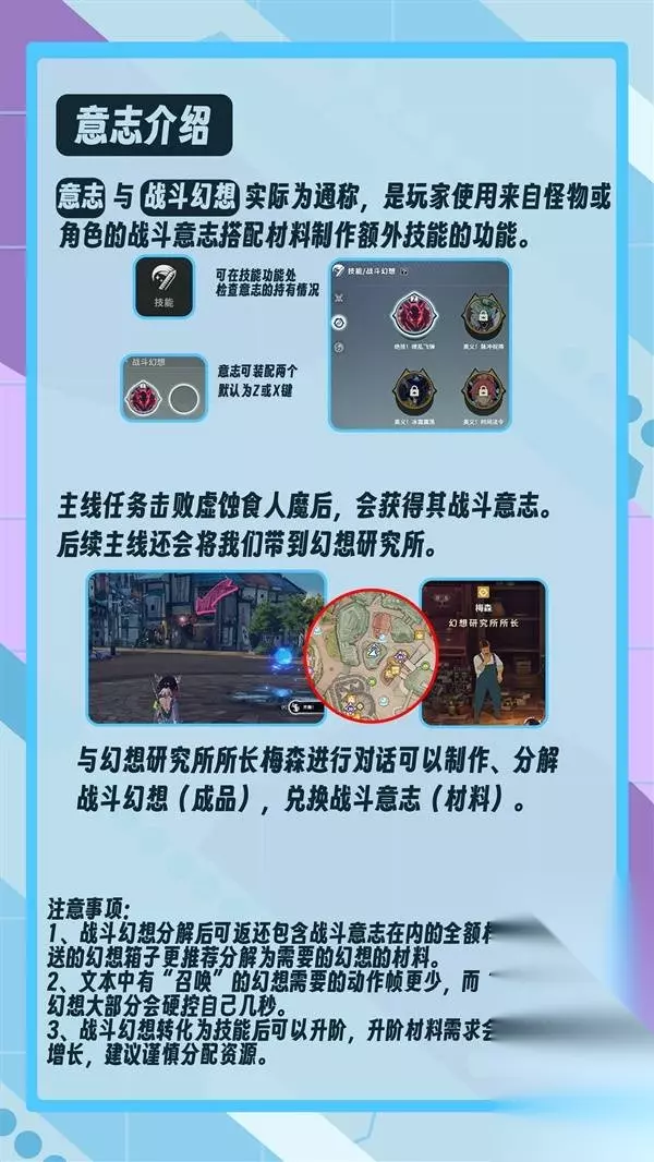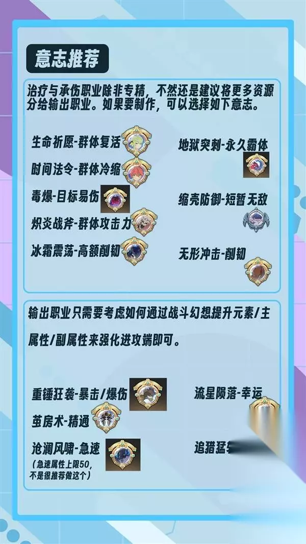 《星痕共鸣》还有玩家不太了解游戏中战斗幻想系统,下面请看由“粉红兔子official”为大家带来的《星痕共鸣》战斗幻想系统介绍,希望能够帮助到大家。 在选择意志方面,由于防护职业(T)及治疗职业(奶妈)能携带的意志性价比相对有限,毕竟意志的主要功能还是提供输出能力,除非下定决心不玩任何输出职业而专精治疗或防护职业,否则建议还是将这部分资源留给输出职业使用,故不做过多描述 省流版-治疗职业与防护职业”可以(只是有收益,性价比较低,并不代表推荐)”选择携带: 奥义!炽炎战斧-山贼头目,提供全队攻击力辅助 奥义!毒爆-剧毒蜂巢,提供目标易伤 奥义!时间法令-蒂娜,提供全队冷却恢复 奥义!生命祈愿-艾露娜,提供群体复活 奥义!冰霜震荡-寒霜食人魔,提供超高额削韧 奥义!地狱突刺-铁牙,提供个人永久霸体,提升抗干扰能力 绝技!缩壳防御-污染蟹蛛,提供短暂个人无敌 绝技!无形冲击-巨魔,提供削韧 以及你认为需要的属性加成意志,防护职业选择力量/职业对应属性的元素强化,治疗职业选择智力加成,特定职业需要的暴击/精通/急速/幸运等,具体请查看游戏内文本。 输出职业就很简单了,选择你需要的元素/主属性/副属性意志来强化进攻端即可。 推荐的选项 奥义!重锤狂袭-姆克头目,提供暴击率与爆伤加成 奥义!茧房术-幻妖蟹蛛,提供精通加成 奥义!苍澜风啸-圣域飞鱼-提供急速加成←但并不太推荐这个,目前版本急速较为微妙且上限为50太容易溢出,建议自己确定真的需要这个再考虑制作 奥义!流星陨落-飓风哥布林王,提供大量幸运收益 绝技!追猎猛斩-姆克尖兵,提供需要连击的相对高额攻击力增益 以及你需要的力量/敏捷/智力或是职业对应属性的元素强化,具体请查看游戏内文本 你需要知道的一些小知识 1.成品(即能直接在背包内使用)的战斗幻象可以在所长梅森处分解,可获取制造所需要的全额材料,也就是说,游戏初期赠送的意志三选一箱子是可以分解并使用这些材料制作一个你更需要的紫色意志的,还请考虑后再开启这个三选一箱子 2.意志文本中有提到”召唤”或是”变身”为XX,召唤通常来说意味着不会占用过多人物的动作帧,而变身往往伴随着较大的硬直,人物可能会在数秒内陷入无法自由行动的状态,还请注意。 3.意志转化为技能后,升阶需要的材料是逐渐上升的倒金字塔型,而npc型意志会需要消耗更多的材料,如何分配手中的养成资源还请慎重考虑