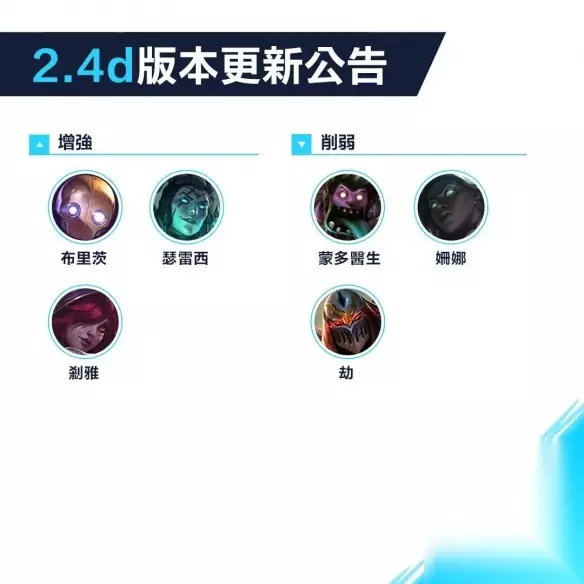 二、更新相关 在LOL手游2.4D版本的更新中,增强了蒸汽机器人·布里茨、魂锁典狱长·锤石、逆羽·霞三位英雄;削弱了祖安狂人·蒙多、涤魂圣枪·赛娜、影流之主·劫三位英雄。