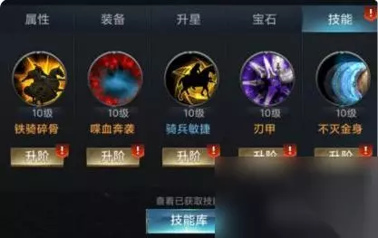 4、骑兵技能搭配:喋血奔袭、铁骑碎骨、不灭金身、刃甲、骑兵敏捷。此搭配攻击时有几率将将伤害转化为士兵,被攻击有几率减少所受伤害。