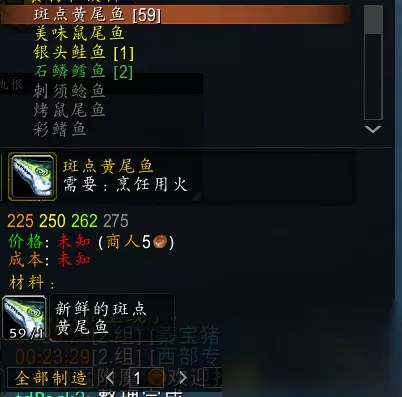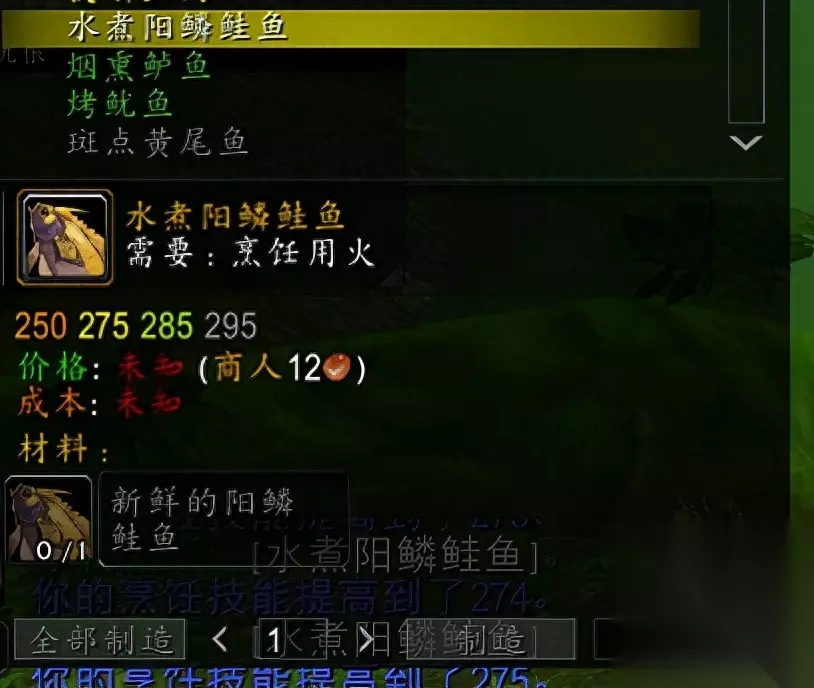这时如果正常的话,你的钓鱼技能应该比烹饪高了!带上鱼饵,去艾萨拉,钓一组黑爪龙虾,基本上就能到300了!300后继续去赞加沼泽,继续掉刺鳃鲑鱼,练到325,基本上就可以学所有烹饪了 不要着急去等级高的海域钓鱼,不上钩费时间!