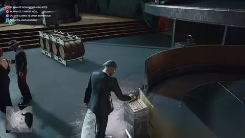 向西南偏南方向行驶,进入生产室,然后上到金属平台上。询问葡萄破碎机。站在塔玛拉身后,而巴尔加斯正在做他的导游的事情。 伯恩伍德会用收音机制造分心。等到巴尔加斯的背转过来,然后给塔玛拉一推。这将为你赢得纸浆摩擦暗杀挑战。 选项4:询问发酵罐