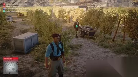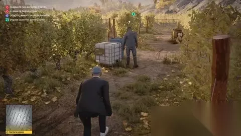 放下壁架两次,你会降落在巡逻人后面。制服他,把他藏在花里,穿上伪装,继续穿过葡萄田,前往主楼。