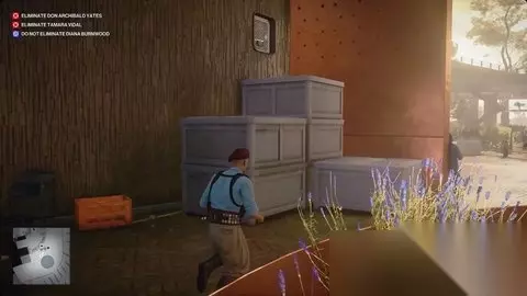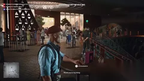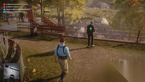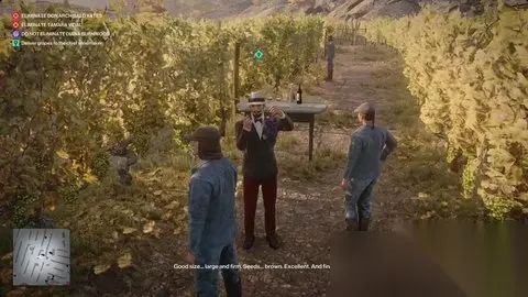 制服他,穿上科尔沃黑的伪装,把他的尸体扔在你身后的花坛里。 与接待处交谈 回到楼下,向南穿过发酵中庭,在接待处办理入住手续。 加入其他客人 向外和向左走,找到通往葡萄田的楼梯。接近维达尔和伯恩伍德。 渗透葡萄田→调查滞留