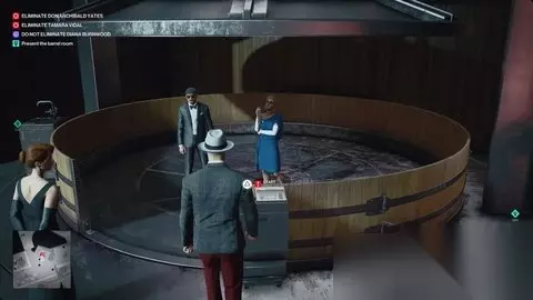 回到首席酿酒师的餐桌上,交出葡萄。听他关于葡萄的狂欢,然后回到东北找回你的科尔沃黑伪装。 加入其他客人→关注首席酿酒师 跳上栏杆,回到维达尔和伯恩伍德。游览开始时,请跟随。 当你得到提示时,问一个巴尔加斯先生的问题。 你的屏幕上会有四个图标,每个图标都是消灭塔玛拉·维达尔的方法。保存在这里,如果你想积累一些挑战。 选项1:询问葡萄压榨机