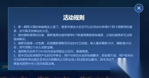 活动时间:9月18日-9月31日 活动规则: 1、新一期阿卡丽的神秘商店上线了。登录并绑定大区后可以在活动中获得6个阿卡丽推荐的道具,仅可购买到绑定的大区。免费领取永久皮肤奖励 2、提供刷新道具的功能,刷新道具功能将推荐6个新道具替换现有道具,之前的道具将无法再继续购买。 4、道具购买后将于24小时内发放到指定大区内,敬请留意。 5、因本活动及其规则产生的任何争议,用户与举办方友好协商解决,若协商不成,用户和举办方均同意将争议提交至举办方即公司所在地人民法院诉讼解决。因本活动及其规则的一切事宜均适用中华人民共和国法律。