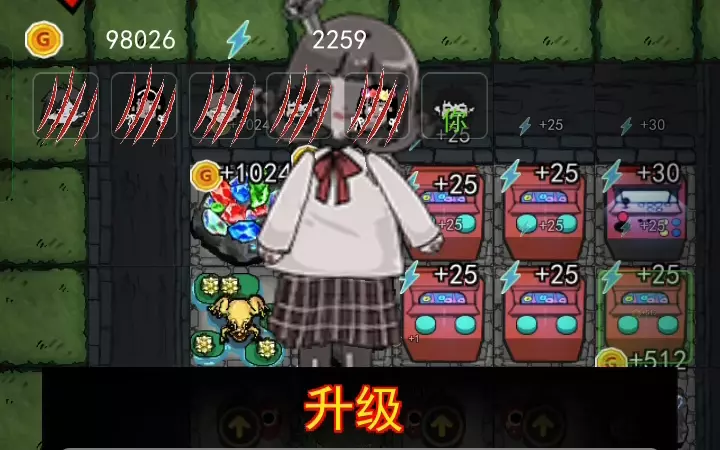 这是《猛鬼宿舍》的玩法教程攻略,开局先将游戏机升级到满级,积累资源,把猎梦者养到满级后,布置满房间的圣光炮台来击败它,图中展示了游戏机升级、资源积累等相关游戏界面。