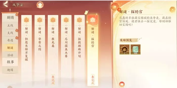 1、首先跟着剧情任务走,进入房间中,然后变身为鲶鱼,找到烛火、树枝、铜屑、陶片五个物品。 2、将五个物品分别放入对应机关内,然后进入鲶鱼宫中。 3、进入【探索:仔细检查各处】任务时,依次检查下图标记的11个位置。 4、进入【寻物:找到可打开三才箱的物品、找到清除水草的工具】,每个图标点两次,可以找到小刀、三才箱·地箱钥匙、三才箱·天箱钥匙,打开旁边的两个箱子获得蓝玛瑙珠、羊脂玉球,给破碎的箱子清除水草获得残破书页,最后将蓝玛瑙珠、羊脂玉球分别放入狮子像和香炉中可以获得半张藏宝图,与鲶天赐战斗,然后离开鲶鱼宫将宝图交给范蠡就能完成解谜任务了。