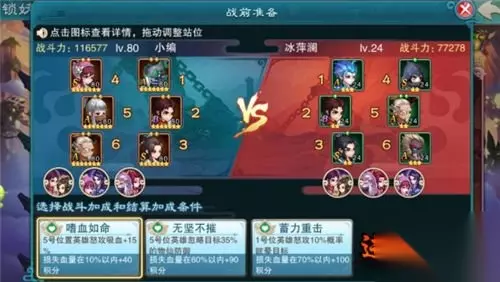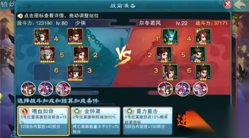 爬塔绝技二:策略的选择 选择模式后,选择战斗加成和结算加成条件,条件是随机的提供三条,最终要求和最终积分加成都是不一样的。 前期需要尽可能的选择加分高的策略,随着爬塔层数上涨,渐渐以保守策略为主。 重要的是英雄的站位,5号位的英雄怒攻吸血+15%,最好选择高爆发的少血英雄,例如夏侯琳。