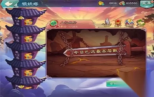 每次锁妖塔开启,积分只升不降,比拼的是闯过多少层,拥有多少积分,并不会被其他玩家从锁妖塔高处击落。 爬塔绝技一:难度的选择 在爬塔前,建议将今日的体力花光,所有装备升级升品洗练,所有英雄升级升品升星,最后再爬锁妖塔。 每天早晨五点才重置锁妖塔层数,所以当一天的冒险结束了再去爬锁妖塔,才是最佳时刻! 前期尽量选择困难模式,尽可能向上攀登,实在过不去,再选择普通或者简单模式,毕竟积分越多,奖励越多嘛!