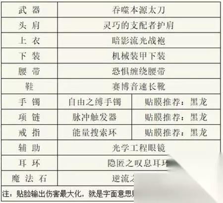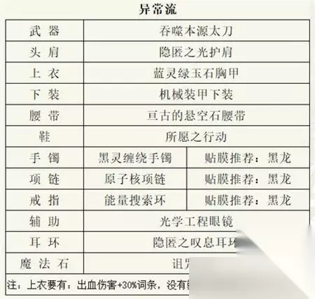 二、异常流 1、武器:吞噬本源太刀 2、头肩:隐匿之光护肩 3、上衣:蓝灵绿玉石胸甲 4、下装:机械装甲下装 5、腰带:亘古的悬空石腰带 6、鞋:所愿之行动 7、手镯:黑灵缠绕手镯 贴膜推荐:黑龙 8、项链:原子核项链 贴膜推荐:黑龙 9、戒指:能量搜索环 贴膜推荐:黑龙 10、辅助:光学工程眼镜 11、耳环:隐匿之叹息耳环 12、魔法石:诅咒之心