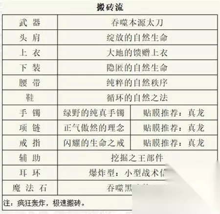 三、搬砖流 1、武器:吞噬本源太刀 2、头肩:绽放的自然生命 3、上衣:大地的馈赠上衣 4、下装:隐匿的自然生命 5、腰带:纯粹的自然秩序 6、鞋:循环的自然之法 7、手镯:绿野的纯真手镯 贴膜推荐:真龙 8、项链:正气傲然的理念 贴膜推荐:真龙 9、戒指:闪耀的生命之戒 贴膜推荐:真龙 10、辅助:挖掘之王部件 11、耳环:爆炸型小型战术信号弹 12、魔法石:吞噬黑暗的心脏