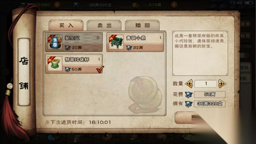 翡翠玲珑杯处理: 1、卖掉 把翡翠玲珑杯卖给陈掌柜,可以获得2两银子 2、留着 也可以把翡翠玲珑杯留下来,有可能会是后续道具