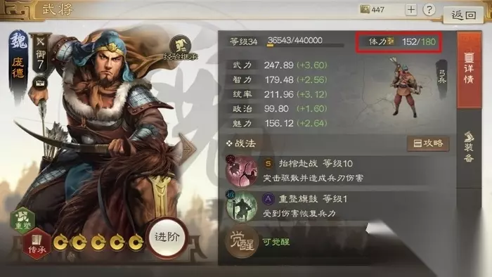 这个游戏里的体力是单个武将的属性,基础是每个武将120点体力,在每天0点到12点会提升到160点。正常情况下武将的体力是每3分钟恢复1点,也就是6小时可以回满120点体力。如果将武将放在校场里的话会降低60%的武将体力恢复速度。