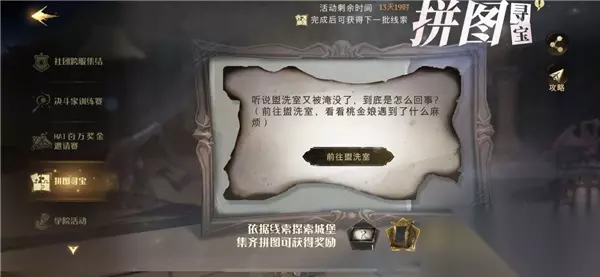 活动规则: 有效活动时间内,每天可直接获取两条线索,不过需要在桃金娘出获得,线索主要是指向城堡内的某个地方,第四期活动一共有16条线索; 当玩家成功解开谜题后可有效的、获得拼图碎片,提前完成集齐拼图碎片便可获得活动的最终奖励; 拼图集碎片终极奖励: 当期设定集*1、随机画像*1、金币*8000。 拼图寻宝攻略 10月20日寻宝点:图书馆门口、魔药课教师;