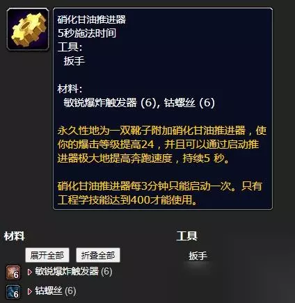制作材料:敏锐爆炸触发器*6、钴螺丝*6 附魔效果: 永久性地为一双靴子附加硝化甘油推进器,使你的爆击等级提高24,并且可以通过启动推进器极大地提高奔跑速度,持续5 秒。 硝化甘油推进器每3分钟只能启动一次。只有工程学技能达到400才能使用。