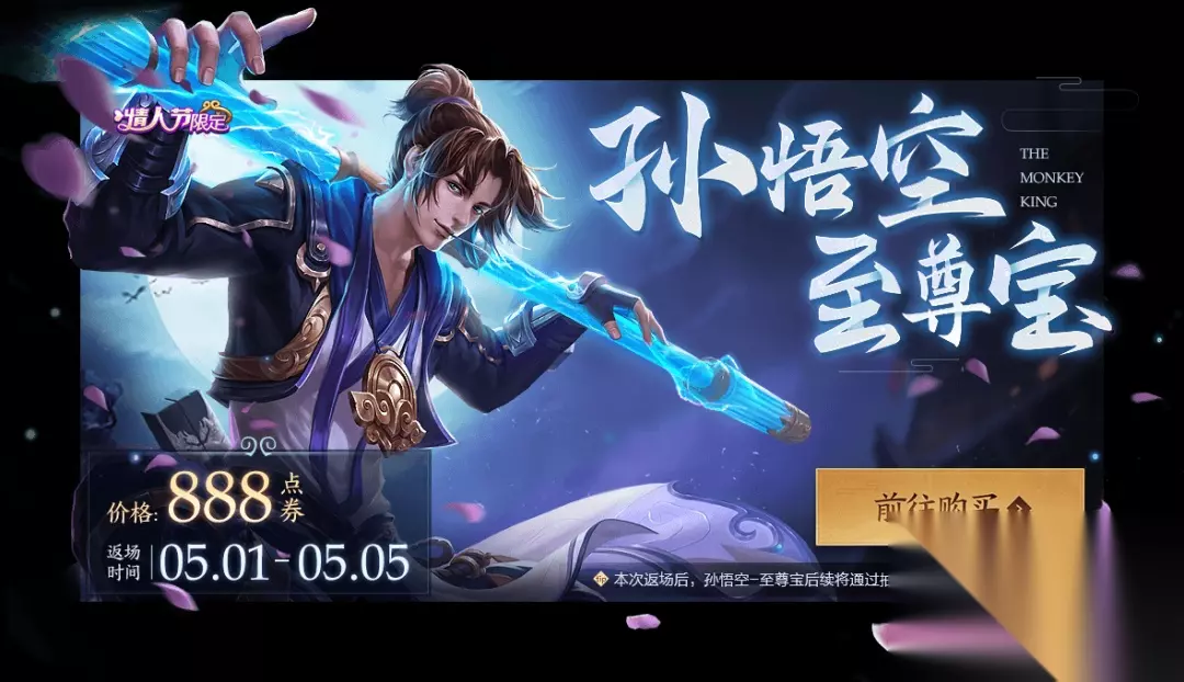 【返场时间】 2020年5月1日0:00-5月5日23:59 【返场价格】 888点券 【返场详情】 本次返场后,孙悟空-至尊宝将不会再通过直售的方式返场,同时也不会再进入后续周年庆限定皮肤返场投票池,未来召唤师仍然有机会在一些重要节点的限时活动中抽奖获得。 以上就是王者荣耀孙悟空至尊宝什么时候返场全部内容,更多精彩请关注233乐园王者荣耀专区,或者到百度上搜索“王者荣耀233乐园”,第一时间掌握王者荣耀最新动态! 【小编推荐】专区入口 || 视频站入口 || 体验服申请入口 || 全民竞猜赢好礼 【新英雄爆料】| 司马懿 || 瑶 || 孙策 || 新英雄:囚徒/书圣/瞬 | 【新皮肤爆料】| 李白团战皮肤:敏锐之力new || 诸葛亮团战皮肤:掌控 || 典韦穷奇皮肤 Hot!! | 王者荣耀最新攻略 赛季段位继承表 每日一题 边境突围玩法攻略 体验服爆料