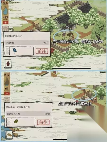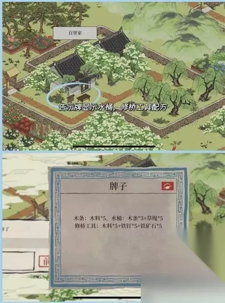 江南百景图扬州府探险第二章怎么过?江南百景图扬州府探险第二章旧事百里沉香怎么过?下面小编给大家整理了江南百景图扬州府探险第二章旧事百里沉香通关攻略,快来看看吧! 江南百景图扬州府探险第二章: 1.扬州府探险第二章旧事百里沉香修桥工具配方,制作水桶配方: 木条:木料*5;水桶:木条*3+草绳*5;修桥工具:木料*5+铁钉*5+铁矿石*5。