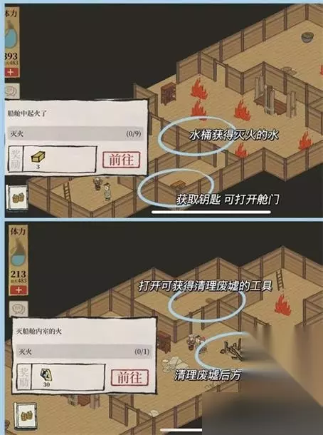 4.灭船舱室内火的顺序:找到藏钥匙的箱子获得钥匙→打开工具箱获得破坏废墟的工具→清理废墟→进入室内灭火。
