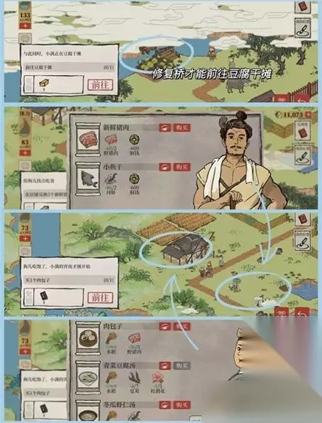 2.打开码头边门需要砍掉挡路的皂荚树。 3.前往豆腐摊需要修复断桥。