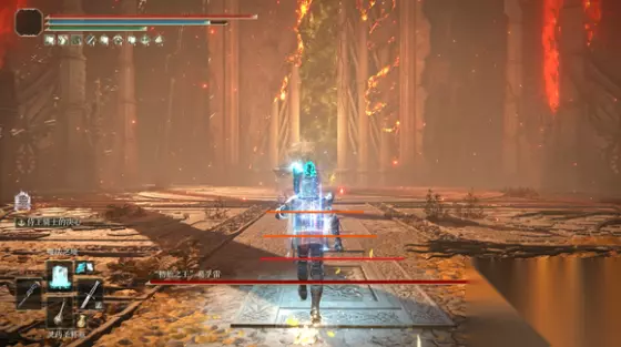 基本全部流程只用到了这些。魔法之境、灵魂激流、月光剑、毁灭流星、菈妮的暗月以及跑图用的化为无形。 下面开始更具体BOSS的流程。首先第一批是最简单的一个激流秒杀的BOSS,分为两类。 第一类是需要在雾门外上buff,进门直接激流的BOSS,操作基本是军旗-喝灵药-魔法之境-决心-进门-激流。军旗一般在进门之前放,然后利用进入雾门动画的把军旗取下来,相当于是白嫖个军旗buff。 第二类需要在进入BOSS场地之后加buff,加buff操作和上面一致。军旗仍然可以在进雾门之前上,进雾门的时候取下来白嫖。 需要在雾门外上buff的BOSS有 禁卫骑士罗蕾塔,狮子混种,“恶兆妖鬼”玛尔基特,“铁棘”艾隆梅尔,“恶兆之子”蒙格,“初始之王”葛弗雷(幻影) 站在雾门外上buff需要紧贴雾门,保证法阵可以延伸到雾门内,进入雾门原地放激流可以吃到法阵的加成。 进门上buff的BOSS有 “龙王”普拉顿桑克斯,”死龙“弗尔桑克斯,“碎星”拉塔恩,“圣树骑士”罗蕾塔,“熔岩土龙”马卡尔,“接肢”葛瑞克,诺克史黛拉的龙人士兵,老将尼奥,“鲜血君王”蒙格,“恶兆王”蒙葛特,“百智爵士”基甸·奥夫尼尔 这些BOSS除了龙王需要仿身泪滴拉仇恨之外,剩下的都是进门跑到激流射程附近上buff直接射就可以直接打死。 除了激流能秒杀一多半BOSS之外,余下的主线或者有成就BOSS就需要稍微复杂一些的流程。 野兽祭司/“黑剑”玛利喀斯 黑剑的p1在雾门外上buff进门激流可以秒杀,主要是如何稳定应对p2。 p2的黑剑开局稳定是一个起跳横扫,后续有不同的派生。稳定流程是p2开始直接决心,然后等BOSS开始下落无脑打出三下月光剑。虽然会吃到一个横扫的伤害,但是三下月光剑足以击杀p2。第一刀硬吃之后,黑剑的第二刀是砍不到的,第三刀出手之前我们的第三刀会先出手,可以稳定击杀。 “初始之王”葛弗雷/战士荷莱·露 p1进门往前走,走到如图所示的第三块砖前沿上buff激流。