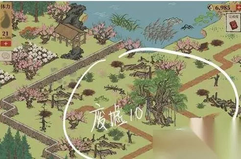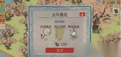 废墟修好会变成花圃和酒酿坊; 这样任务就完成了。 任务二:去年桃花 酒酿坊修好后,去里面换桃花仙露; 点右上角的休憩桌,进入回忆模式;