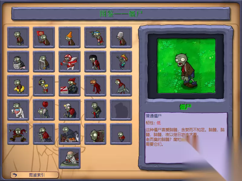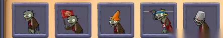 僵尸篇: ZOMBIE(僵尸):最普通的僵尸,生命低,移动速度慢 FLAG ZOMBIE(僵尸旗手):就是僵尸拿个旗子,会在每次僵尸浪时出现在第一位,除了显示到僵尸浪了和普通僵尸没有任何区别,生命低,移动速度慢 CONEHEAD ZOMBIE(路障头僵尸):头顶路障的僵尸,生命中等,移动速度慢 POLE VAULTING CONEHEAD(撑杆跳僵尸):手拿撑杆的僵尸,生命中等,拿撑杆时移动速度块,没拿时移动速度慢,特技是利用撑杆跳过第一个阻挡物 BUCKET ZOMBIE(铁桶头僵尸):头顶铁桶的僵尸,生命高,移动速度慢