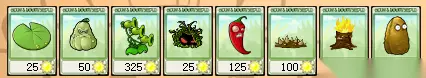 SEA-SHROOM (海蘑菇):攻击类植物,PUFF-SHROOM的水中版,直线中距离攻击,伤害中等,攻击速度快,价格0 PLANTERN (规划者):辅助类植物,可以清除周围25格范围内的雾,价格25 CACTUS (仙人掌):攻击类植物,直线远距离攻击,伤害中等,攻击速度快,可以将气球僵尸打下来,价格125 BLOVER (三叶风扇):消耗类植物,安放后立即清除所有雾数秒,并且吹飞所有气球僵尸,价格100 SPLIT PEA (分裂豌豆):攻击类植物,REPEATER与PEASHOOTER合体版,直线远距离攻击,可攻击后方僵尸,正面每次射击一发子弹,背面射击两发子弹,伤害中等,攻击速度快,价格125 STARFRUIT (奇异果):攻击类"植物"??,这个家伙是所有植物中最诡异的,攻击方式太离谱,我就不多做解释,攻击时朝自身每格角的方向射出子弹,非直线攻击,伤害中等,攻击速度快,价格125 PUMPKIN (南瓜):阻挡类植物,拥有WALL-NUT同等的生命,可以安放在任何植物上起到保护作用,价格125 MAGNET-SHROOM (磁力蘑菇):辅助类植物,安放后,会废掉周围25格范围内的一个铁质物体数秒,如,橄榄球僵尸的头盔,铁桶头僵尸的铁桶,梯子僵尸的梯子,矿工僵尸的镐,还有什么来着记不清楚了,价格100