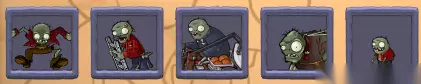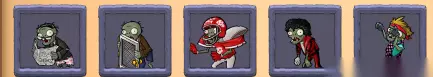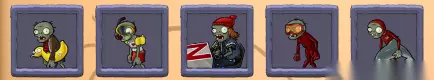 NEWSPAPER ZOMBIE(看报僵尸):手拿报纸的僵尸,如果将报纸打烂会发怒,报纸生命低,僵尸生命低,拿报纸移动速度慢,没拿移动速度很块 SCREEN DOOR ZOMBIE(纱窗门僵尸):手拿纱窗门的僵尸,纱窗门会抵消SNOW PEA的减速效果,纱窗门生命高,僵尸生命低,移动速度慢 FOOTBALL ZOMBIE(橄榄球僵尸):橄榄球运动员僵尸,生命非常高,移动速度块 DANCING ZOMBIE(跳舞中的僵尸):其实就是麦克尔.杰克逊僵尸,生命中等,移动速度慢,特级是在自身左右上下方召唤4个倒退舞者. BACKUP DANCER(倒退舞者):跳着舞的僵尸,生命低,移动速度慢