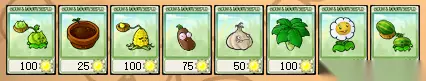 CABBAGE-PULT (卷心菜投抛者) :攻击类植物,直线抛射攻击,伤害中等,攻击速度快,价格100 FLOWER POT (花盆):这只是花盆而已,放置后可以在上面安放陆地植物,价格25 KERNET-PULT (玉米投抛者):攻击类植物,直线抛射攻击,伤害低,攻击速度快,有一定几率抛出"玉米砖"造成中等伤害,并且打晕被命中的僵尸,价格100 COFFEE BEAN (咖啡豆):辅助类植物,安放在SHROOM系列植物上,使其可以在白天的战斗中正常使用,价格75 GARLIC (大蒜):辅助类植物,安放后,将任何"品尝"过其味道的僵尸驱赶至其他道路,价格50 UMBRELLA LEAF (雨伞叶):辅助类植物,安放后,保护自身周围9格内的植物不被蹦极跳僵尸抓走,不被投石车僵尸攻击,价格100 MARIGOLD (金盏草):经济类植物,安放后,每过数秒掉落一个银币或者金币,价格50 MELON-PULT (西瓜投抛者):攻击类植物,直线抛射攻击,伤害高,攻击速度快,命中目标后造成9格的范围伤害,价格300
