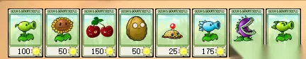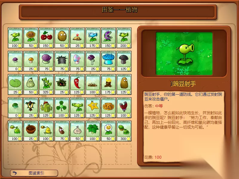 植物篇: PEASHOOTER (豌豆射手):最初拥有的攻击类植物,直线远距离攻击,伤害中等,攻击速度快,价格100 SUNFLOWER (向日葵):最初拥有的经济类植物,每过数秒掉落一颗大太阳币,白天战斗主要的经济来源.价格50 CHERRY BOMB (樱桃炸弹):消耗类物,安放后马上爆炸,对周围9格内所有单位造成巨大伤害,价格150 WALL-NUT (城墙坚果):阻挡类植物,放下后会阻挡僵尸拖延时间,拥有较高的生命,价格50 POTATO (土豆):消耗类植物,安放后不会马上生效,须经过数秒左右的等待才会生效,会对靠近的一个僵尸造成巨大伤害,价格25 SNOW PEA (雪花豌豆):攻击类植物,直线远距离攻击,伤害低,攻击速度快,会对命中的目标造成减速效果,价格175 CHOMPER (咀嚼者):攻击类植物,近距离直线攻击,伤害极高,攻击速度极慢,价格150 REPEATER (食人豌豆):攻击类植物,PEASHOOTER的升级版,一次发射两发子弹,直线远距离攻击,伤害中等,攻击速度快,价格200