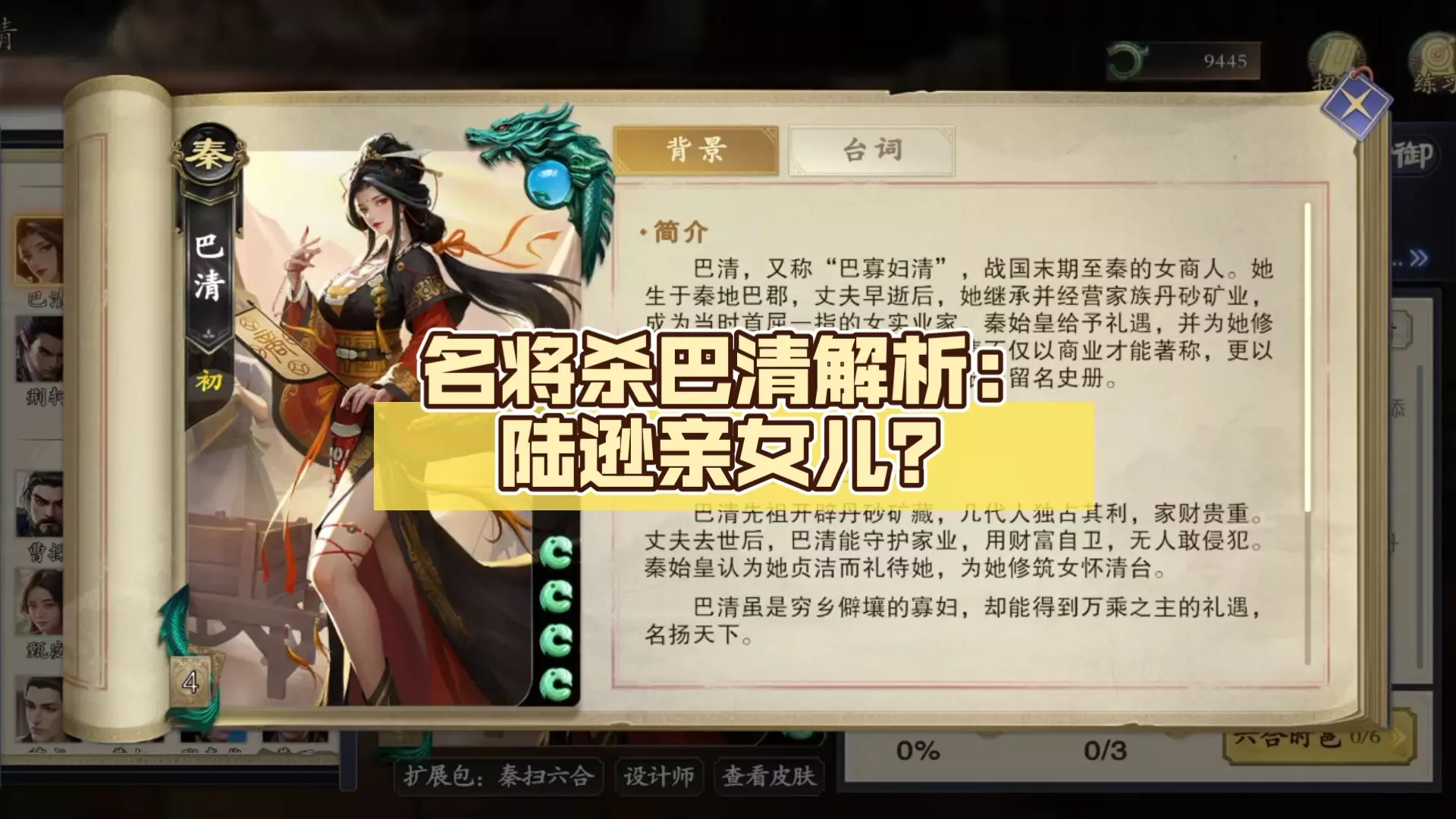 这是《名将杀》新稀有武将巴清的解析,她是4手牌4体力上限的秦阵营武将,拥有礼抗万乘、丹砂女王、怀清台三个技能,丹砂是其技能核心,能辅助配合、减伤,阵亡后还有特殊机制,是强力配合型武将。