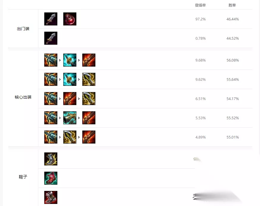 装备推荐 出门装备推荐:多兰之刃+血药。 核心装备推荐:海妖杀手,岚切,疾射火炮,无尽之刃,收集者。 鞋子推荐:狂战士胫甲,明朗之靴,铁板靴。