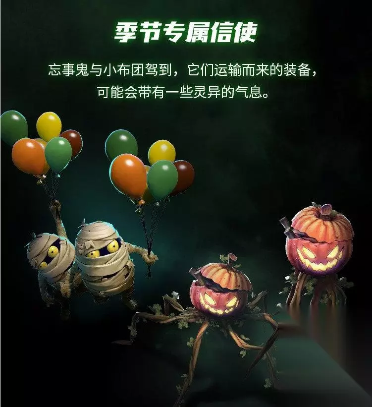忘事鬼是一个邪恶的南瓜头,借助于藤蔓蜿蜒爬行。你的装备将被它装载在南瓜头内。 而小布团则相对更加可爱一些,浑身包裹着的绷带虽然为它增添了些许灵异的感觉,但是手持气球的蠢萌风格,依然能够令你回想起在DOTA2世界中度过的每一段快乐时光。 更多奖励,等你获取 除此之外,游玩DOTA2,在夜魇暗潮活动期间集满积分,你也有机会获得以下奖励: l 夜魇暗潮着色特效,活动期间可用 l 夜魇暗潮守卫:鸟鸟和泡泡 l 夜魇暗潮连杀配音,连杀系统广播 l 夜魇暗潮击杀特效,连杀特效,活动期间可用 l 聊天语音与音效,共13条,活动期间可用 l 灵异击掌 击掌特效 活动期间可用 l 神秘物品,随机套装或单件 l 夜魇暗潮指针,鼠标指针 l 天梯积分双倍投入代币,单次使用,活动期间可用 l 灵异聊天表情,共10个 l 灵异喷绘,共10幅,活动期间可用 l 夜魇暗潮死亡特效,死亡特效,活动期间可用