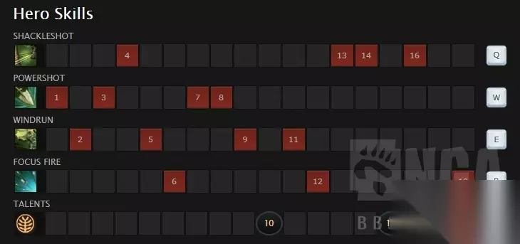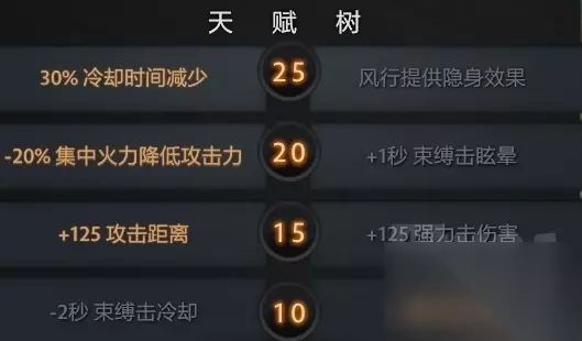 技能解析 1. 束缚击 成功捆到的晕眩时间是2.0/2.6/3.2/3.8,蓝耗70/85/100/115,判定的捆绑范围是束缚击施法地点与目标地点直线目标身后的左右23°(也就是总计46°)。 考虑到中单很难把对面捆到树上,所以束缚击最多加1级,一般不加。 单杀时:记得算自己的伤害,等你觉得在捆到的3s左右之内能杀的时候再捆,要不然对面很容易跑掉。 团战:不要随便交捆,一般是捆对面冲上来的前排或者后面等着放技能的酱油(取决于你是被对面冲脸还是能够跳刀切后排) 2. 强力击 伤害150/250/350/450,伤害范围为2600*125的一个长方形,每打到一个单位伤害衰减20%,最大施法时间为1,施法每多0.03s伤害增加5/8.33/11.67/15,箭飞过的地方提供高空视野并且可以破坏周围75范围内的树木。 释放的时候一般往对面的下一个移动位置释放,等对面移动到位置再松手就可以了,不用每次都追求施法1s的满伤害。当然如果对面被控制的时候,自然是追求最大伤害。 3. 风步 提供60%移速加成和100%闪避,对周围325半径内的敌人减速15%/20%/25%/30%,持续时间3/4/5/6,A帐给2点充能、提供105%风步移速加成并且移除移速上限,25级天赋给隐身。 风步使用的好坏是决定你这盘风行能否秀起来的关键。对于一些仅有物理伤害的英雄,风行者的风步可以秀他们一脸(比如TA、狼人、小骷髅、先知等)。 记得风步是可以被驱散的,比如卡尔的吹风、魅惑魔女的魅惑和暗影恶魔的大招,尤其是暗影恶魔大招是一个持续驱散并且可以作用于BKB,所以即便你出了A帐也没用。 对线期记得经常用风步去跟对面换血,如果你的对线功底过硬可以把对面打的很难受。 4. 集中火力 降低攻击力50%/40%/30%,持续时间20,冷却时间70/50/30。 集中火力期间风行者只要移动就会自动攻击目标英雄,除非玩家停止移动或者使用径直移动。 只会降低风行者的攻击力,而物品特效(比如金箍棒、标枪和散失)不受影响。 集中火力期间可以攻击别人,而不影响风行者的集中火力buff。 所以加点的优先级是有大点大,先满强力击然后风步,最后补满束缚击。一般来说7级的时候你想要1-3-2-1或者0-3-3-1(如果不需要束缚击的话)。