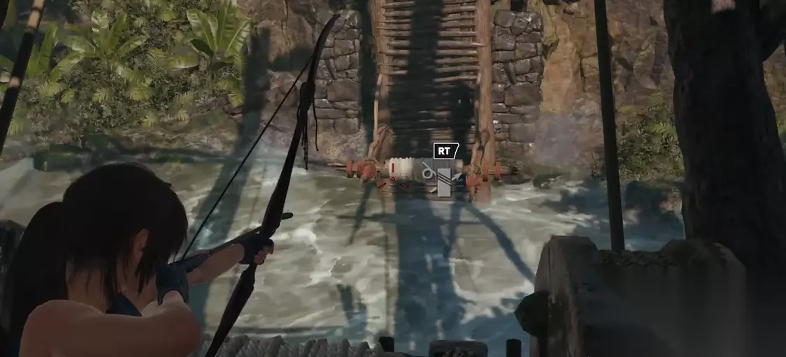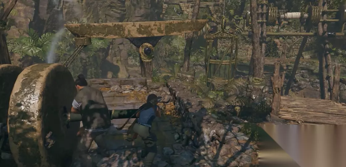 秘鲁丛林的断桥处,需要利用水利机关将木桥升起来。首先来到断桥前,根据对话提示需要上水塔顶开排气阀。沿着石轮后面的木梯爬上去,拉动开关让水塔工作起来。接着回到石轮处,一起推动机关将水流导入绿色容器。如果动作太慢,绿色容器里的水会流干,那就得从头再来一遍。建议提前准备好绳索箭矢,避免手忙脚乱。