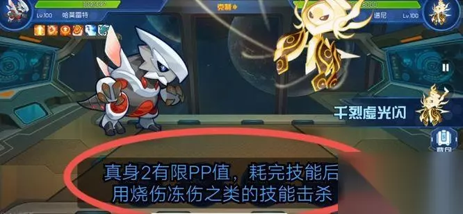 谱尼真身2是有限的PP值,耗完技能后,用烧伤冻伤之类的技能击杀。