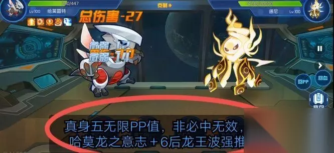 谱尼真身5有无限的PP值,非必中无效,使用哈莫龙之意志+6后,龙王波强推。