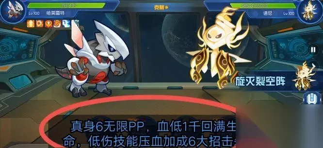 谱尼真身6有无限的PP值,血低1千直接回满生命。使用低伤技能压血量,再加成6级攻击,使用大招直接击杀。