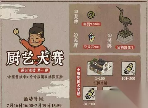 (备注:一小时最多做9道菜,活动3天一共能做648个奖牌。 (备注:台服经验来看,不点NPC和活动入口不算参与排名,这点很重要!) 厨艺大赛须知 奖牌除了个人奖励,还会计入排行榜,知府大人积极参与有机会拿额外奖励。 玩家会随机分组,每组5000人,不是全服一个排行榜。 小组赛结束30分钟后结算奖励。 技巧或避坑点 ① 客栈香料仓库越大越好,月卡110格,普通55格,提前攒香料。客栈最多放四张桌子,每5分钟刷新一个客人,离线时一般只刷新一个。香料方面,厨师只剩一道菜时,容易出那种菜的香料,但两道菜要同一种香料时,客人给的是随机的。(台服大佬说有“卡香料”技巧,概率比随机大点,有兴趣的可以试试) ② 御厨要的香料自己没有就放弃,等20分钟刷新下一道菜。 ③ 每组5000人,分组看参与先后,越早参加越“肝”,越晚越轻松。游戏里不点NPC和活动入口不算参与,什么时候点什么时候算开始。 ④ 奖牌数量相同排名一样,小组前100名就行,40个奖牌差不多5小时能拿,建议后两天参与。其实比小组第一少99个就很稳。 ⑤ 虽然是“肝帝”活动,但不用拖慢发育,萌新不用急着升级仓库,香料卖了也影响不大,边玩边攒就行。 最关键的是: 奖牌数量再多,分到佛系组也没用! 以上就是御厨大赛的玩法和注意事项,希望能帮到玩家。江南百景图的攻略和资讯还有很多,感兴趣可以多看看。 活动结束后,奖牌奖励和排行榜是实打实的,但别为了活动拖慢节奏。适度参与,既能拿奖励,又能享受游戏,这才是正理。