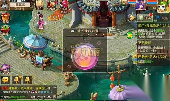 七彩点泡泡时间 活动期间每天中午12:00-13:00,晚上18:00-19:00,22:00-23:00 七彩点泡泡活动地点 建邺城、傲来渔港、宝象国 七彩点泡泡活动要求 玩家等级≥40级,单人参加 七彩点泡泡解析 儿童节活动期间,可以前往梦幻西游手游长安城,找童梦仙子领取活动专用道具“神奇泡泡水”。与中午12:00-13:00,晚上18:00-19:00,22:00-23:00,前往建邺城、傲来渔港、傲来国参与该玩法。 使用泡泡水后,会出现一个吹泡泡的界面,需要控制力度,长按吹泡泡。吹泡泡进度条越长,泡泡越大,但如果超出了进度条上限,泡泡会被吹破哟。