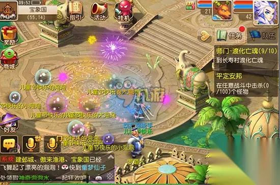 七彩点泡泡活动奖励 各位少侠也可以点击场景内别人吹出的泡泡,每点击一个泡泡,就会获得一份奖励。当一个泡泡被点击次数达到10次,便会破碎。泡泡破碎时,将会升起炫目的烟花,吹出这个泡泡的玩家,也会获得一份奖励。吹出泡泡被点破累计达50次和100次时,可以获得专属的儿童节吹泡泡称谓哟。 各位少侠也可以点击场景内别人吹出的泡泡,每点击一个泡泡,就会获得一份奖励。当一个泡泡被点击次数达到10次,便会破碎。泡泡破碎时,将会升起炫目的烟花,吹出这个泡泡的玩家,也会获得一份奖励。吹出泡泡被点破累计达50次和100次时,可以获得专属的儿童节吹泡泡称谓哟。