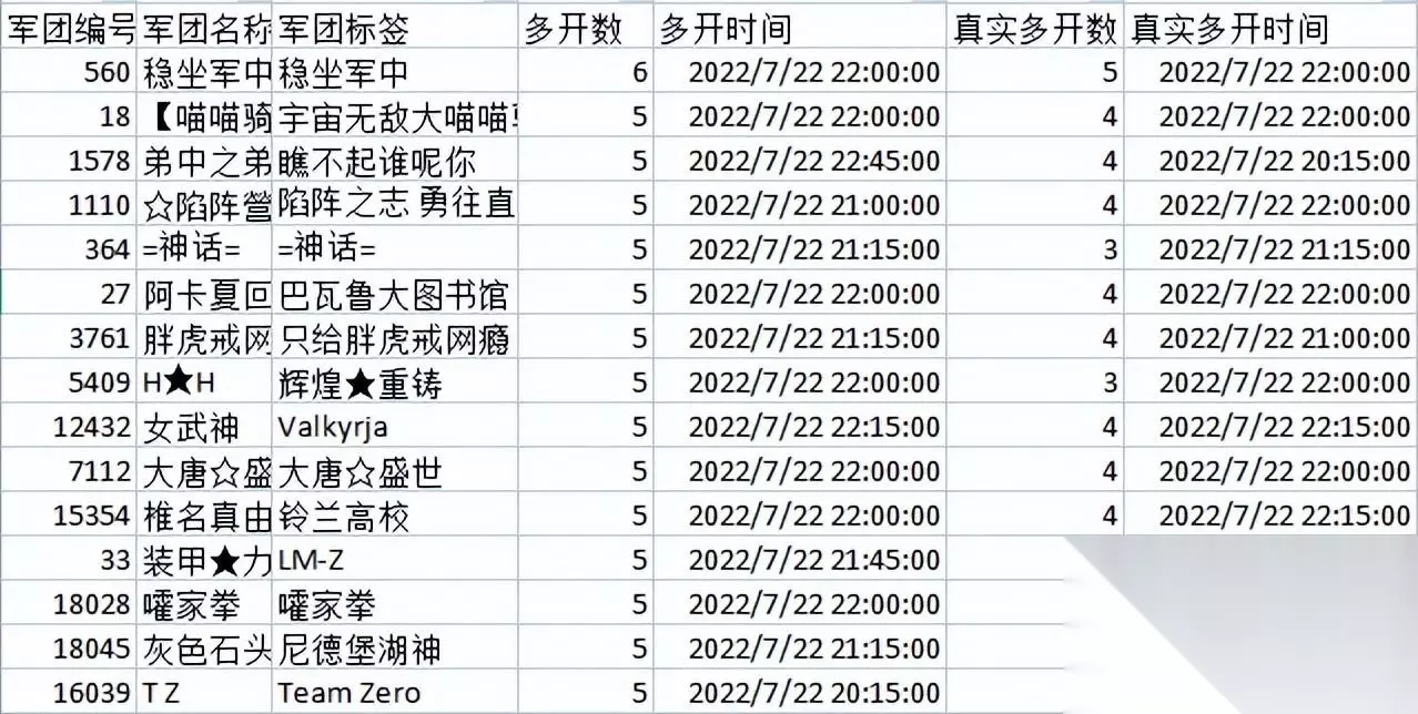 多开数最多的是稳坐军中,最多面对六开的压力,但仅仅完成五开,吃到罚单一张,共有四个军团完成五开成就,分别是稳坐军中,嚯家拳,灰色石头和TZ。 当日最活跃军团
