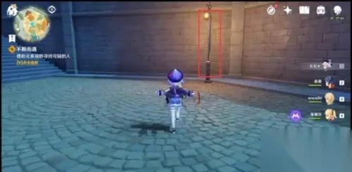 2、到达下图的这个路灯位置会出现派蒙对话,她说脚印消失了,让我们往上爬。