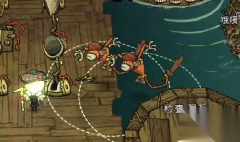 和猎犬袭击事件的机制类似,玩家的生存时间、与月亮码头女王的相隔距离,都是会影响事件发生的概率、冷却,以及事件里出现的火药猴数量。袭击到来之前,玩家能通过背景音乐的变化和角色的台词得到预警,从而有着更好的准备。抢夺玩家物品的袭击是属于大概率出现的,海盗船会逐渐靠近玩家的漂浮物(船只),之后火药猴会跳上玩家的船并放下船锚,收起船帆,在保证船只停止运行后,就开始抢夺物品。